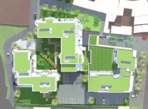 Construits en plein centre-ville, les trois niveaux de logements s’organisent sous forme de « L » ouvert sur un espace central en toiture- terrasse végétalisée.